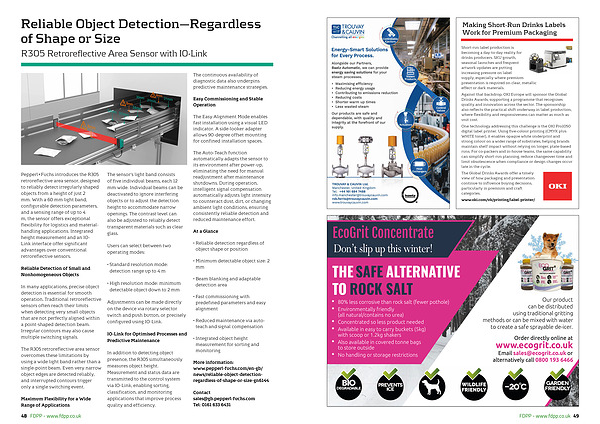 Pepperl + Fuchs introduces the R305 retroreflective area sensor, designed to reliably detect irregularly shaped objects from a height of just 2 mm. With a 60 mm light band, configurable detection parameters, and a sensing range of up to 4 m, the sensor offers exceptional flexibility for logistics and materialhandling applications. Integrated height measurement and an IO- Link interface offer significant advantages over conventional retroreflective sensors.