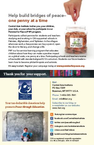 Participants collect pennies for students and teachers studying and working in CAI-supported schools in Pakistan, Afghanistan, and Tajikistan. In the villages where we work, a few pennies can buy a pencil, open the door to literacy, and change a life.