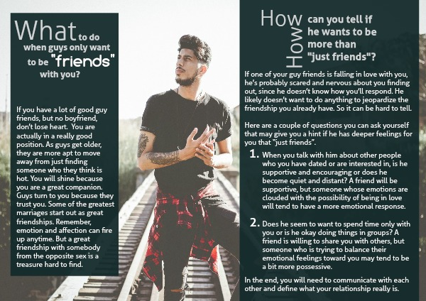 If you have a lot of good guy friends, but no boyfriend, don’t lose heart. You are actually in a really good position. As guys get older, they are more apt to move away from just finding someone who they think is hot. You will shine because you are a great companion. Guys turn to you because they trust you. Some of the greatest marriages start out as great friendships. Remember, emotion and affection can fire up anytime. But a great friendship with somebody from the opposite sex is a treasure hard to find.