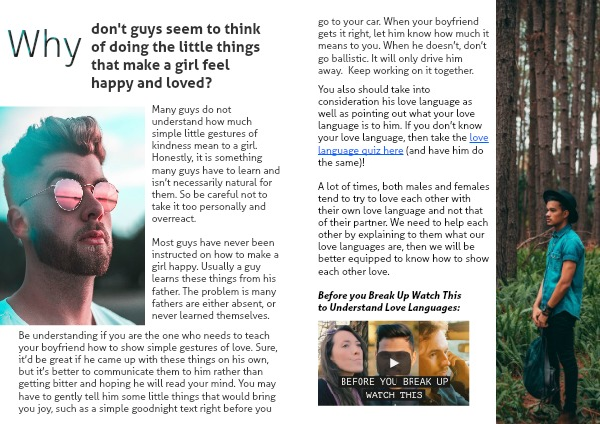 Many guys do not understand how much simple little gestures of kindness mean to a girl. Honestly, it is something many guys have to learn and isn’t necessarily natural for them. So be careful not to take it too personally and overreact.