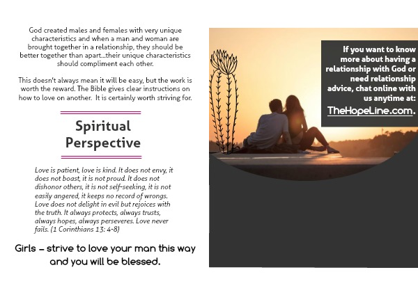 God created males and females with very unique characteristics and when a man and woman are brought together in a relationship, they should be better together than apart…their unique characteristics should compliment each other.