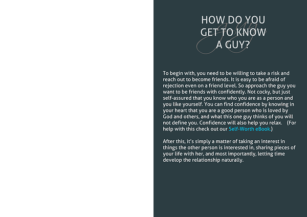 To begin with, you need to be willing to take a risk and reach out to become friends. It is easy to be afraid of rejection even on a friend level. So approach the guy you want to be friends with confidently. Not cocky, but just self-assured that you know who you are as a person and you like yourself. You can find confidence by knowing in your heart that you are a good person who is loved by God and others, and what this one guy thinks of you will not define you. Confidence will also help you relax. (For help with this check out our Self-Worth eBook.)