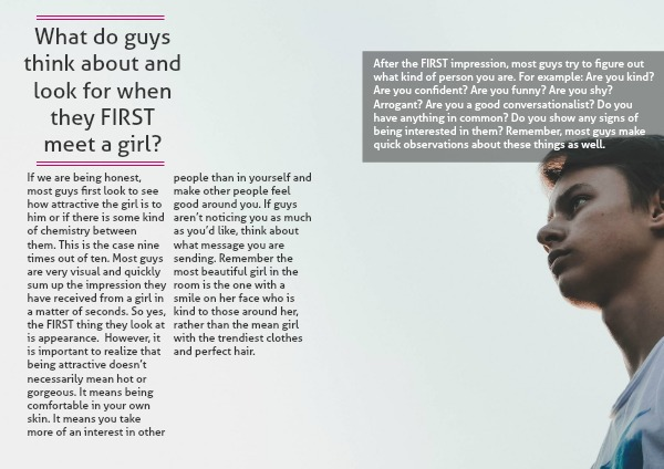 After the FIRST impression, most guys try to figure out what kind of person you are. For example: Are you kind? Are you confident? Are you funny? Are you shy? Arrogant? Are you a good conversationalist? Do you have anything in common? Do you show any signs of being interested in them? Remember, most guys make quick observations about these things as well.