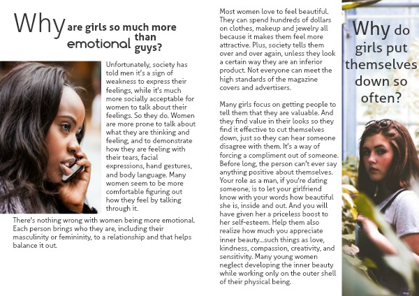 Many girls focus on getting people to tell them that they are valuable. And they find value in their looks so they find it effective to cut themselves down, just so they can hear someone disagree with them. It’s a way of forcing a compliment out of someone. Before long, the person can’t ever say anything positive about themselves. Your role as a man, if you’re dating someone, is to let your girlfriend know with your words how beautiful she is, inside and out. And you will have given her a priceless boost to her self-esteem. Help them also realize how much you appreciate inner beauty…such things as love, kindness, compassion, creativity, and sensitivity. Many young women neglect developing the inner beauty while working only on the outer shell of their physical being.