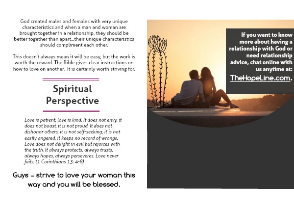 If you want to know more about having a relationship with God or need relationship advice, chat online with us anytime at: TheHopeLine.com.