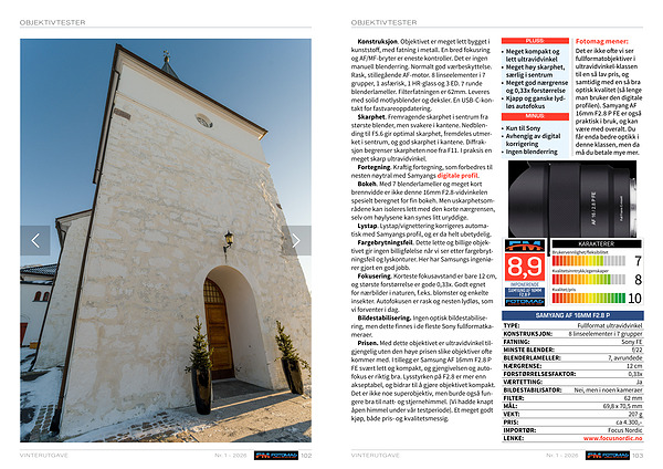 Det er ikke ofte vi ser fullformatobjektiver i ultravidvinkel-klassen til en så lav pris, og samtidig med en så bra optisk kvalitet( så lenge man bruker den digitale profilen). Samyang AF 16mm F2.8 P FE er også praktisk i bruk, og kan være med overalt. Du får enda bedre optikk i denne klassen, men da må du betale mye mer.