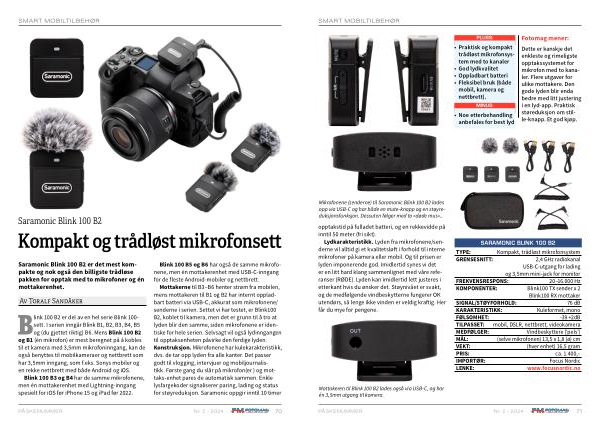 Mikrofonene ( senderne ) til Saramonic Blink 100 B2 lades opp via USB-C og har både en mute-knapp og en støyreduksjonsfunksjon . Dessuten følger med to « døde mus »..