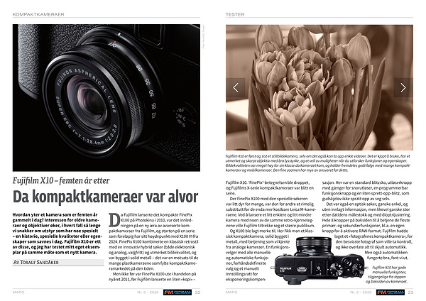 Og X100 ble lagt merke til. Her fikk man et klassisk kompaktkamera, solid bygget i metall, med betjening som vi kjente fra analoge kameraer. En funksjonsvelger med alle manuelle og automatiske funksjoner, forhåndsdefinerte valg og et manuelt innstillingsratt for eksponeringskompensasjon. Her var en standard blitzsko, utløserknapp med gjenger for snorutløser, en programmerbar funksjonsknapp og en liten sprett-opp-blitz, som gudskjelov ikke spratt opp av seg selv.