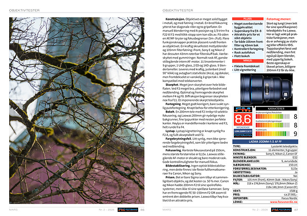 Stort og tungt( men lett for sine spesifikasjoner) teleobjektiv fra Laowa. Her er lagt vekt på praktiske funksjoner, men du er avhengig av stativ og / eller effektiv IBIS. Toppskarphet først ved nedblending, men fint også på åpen blender, med ypperlig bokeh. Beste egenskap er likevel prisen, billigere 200mm F2 får du ikke.