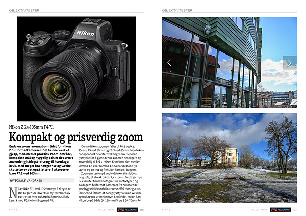 Enda en zoom i normal-området for Nikon Z fullformatkameraer. Det kunne vært et gjesp, men med et praktisk zoom-område, kompakte mål og hyggelig pris er det svært anvendelig både på reise og til hverdagsbruk. Med meget bra nærgrense og værbeskyttelse er det også lettere å akseptere bare F7.1 ved 105mm.