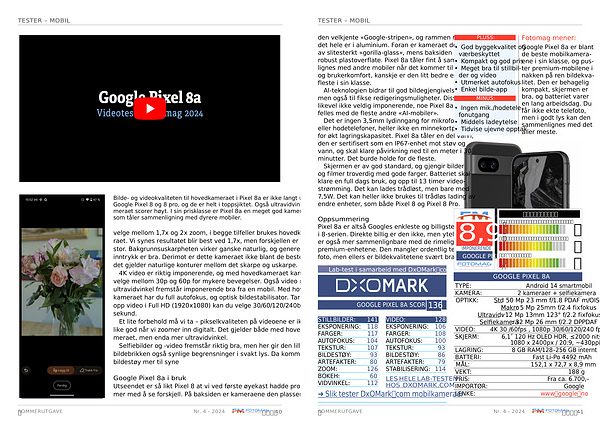 Bilde- og videokvaliteten til hovedkameraet i Pixel 8a er ikke langt unna Google Pixel 8 og 8 pro , og de er helt i toppsjiktet . Også ultravidvinkelkameraet scorer høyt . I sin prisklasse er Pixel 8a en meget god kameramobil som tåler sammenligning med dyrere mobiler .