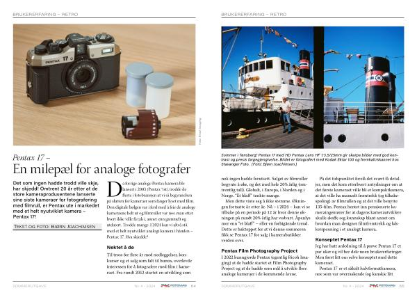 Da forrige analoge Pentax-kamera ble lansert i 2003 ( Pentax * ist ), trodde de fleste i fotobransjen at vi så begynnelsen på slutten for kameraer som fanger lyset med film . Den digitale bølgen var i ferd med å feie de analoge kameraene helt ut og filmruller var noe man etter hvert ikke ville få tak i , annet enn gammelt og utdatert . Trodde mange . I 2024 kan vi altså stå med et helt nyutviklet analogt kamera i hånden – Pentax 17 . Hva skjedde ?