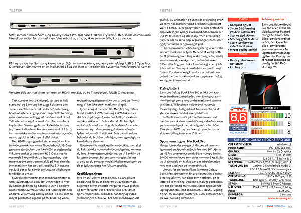 Likevel , for en fotograf kan Samsung Galaxy Book3 Pro 360 være en fin arbeidsmaskin : den har berøringsskjerm , kan tjene som nettbrett , og er lettere å ta med seg . Den kan den duge godt alene , evt . supplert med en ekstern skjerm og passende lagringsenheter . Med 16 GB RAM , 1 TB SSD-lagring og evt . 5G-mulighet ( koster ca . 6.000 ekstra ) er det en svært allsidig allrounder .