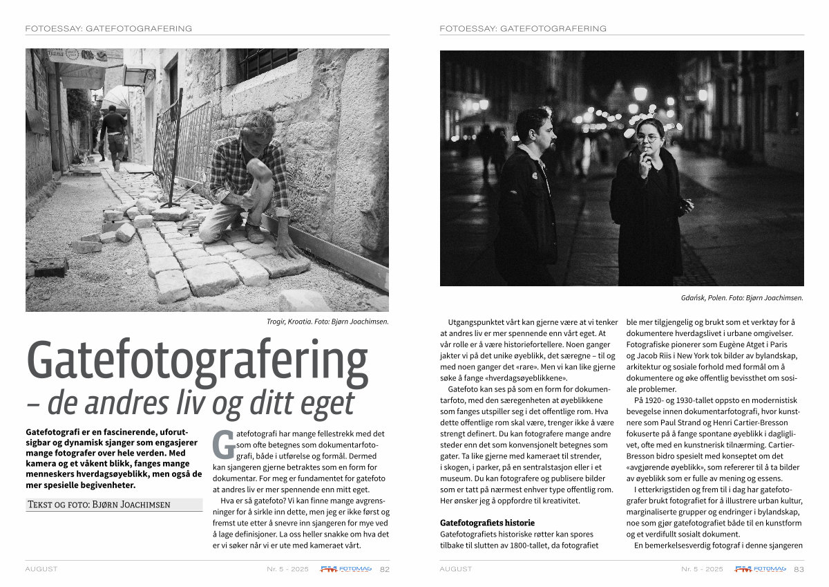 Gatefotografi er en fascinerende, uforutsigbar og dynamisk sjanger som engasjerer mange fotografer over hele verden. Med kamera og et våkent blikk, fanges mange menneskers hverdagsøyeblikk, men også de mer spesielle begivenheter.