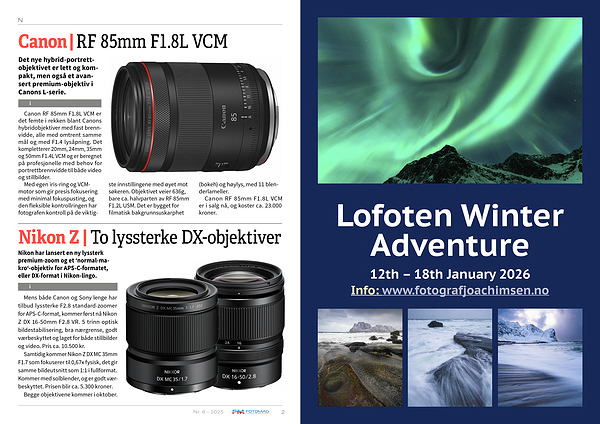 Mens både Canon og Sony lenge har tilbud lyssterke F2.8 standard-zoomer for APS-C-format, kommer først nå Nikon Z DX 16-50mm F2.8 VR. 5 trinn optisk bildestabilisering, bra nærgrense, godt værbeskyttet og laget for både stillbilder og video. Pris ca. 10.500 kr.