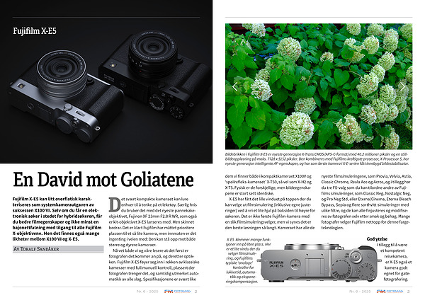 Nå vet både vi og våre lesere at det først er fotografen det kommer an på, og deretter optikken. Fujifilm X-E5 føyer seg inn i rekken av klassiske kameraer med full manuell kontroll, plassert der fotografen trenger det, og samtidig utmerket automatikk av alle slag. Spesifikasjonene er svært like