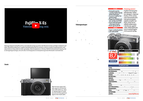 Fotomag mener: Fujifilm X-E5 benytter det klassiske‘ målsøker-designet’ vi kjenner fra bl. a. X-Pro-serien, men i lommestørrelse. Sett på et kompakt objektiv( Fujifilm har flere), så har du en effektiv bildemaskin i lite format, også til video. Bildestabilisatoren er med på å gjøre X-E5 suverent nyttig.