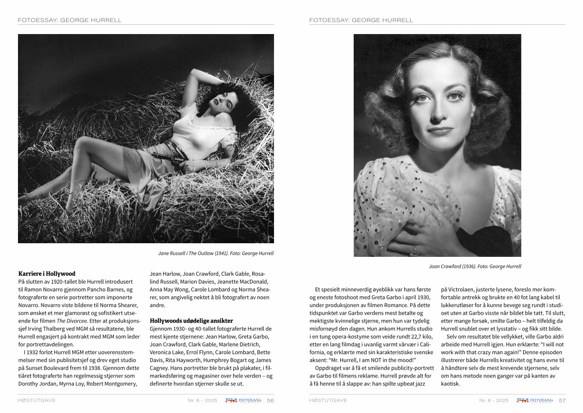 Hollywoods udødelige ansikter Gjennom 1930- og 40-tallet fotograferte Hurrell de mest kjente stjernene: Jean Harlow, Greta Garbo, Joan Crawford, Clark Gable, Marlene Dietrich, Veronica Lake, Errol Flynn, Carole Lombard, Bette Davis, Rita Hayworth, Humphrey Bogart og James Cagney. Hans portretter ble brukt på plakater, i filmarkedsføring og magasiner over hele verden – og definerte hvordan stjerner skulle se ut.