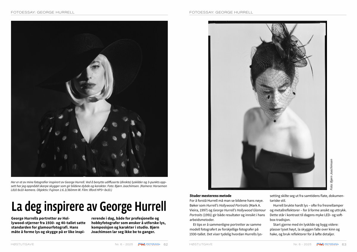 George Hurrells portretter av Hollywood-stjerner fra 1930- og 40-tallet satte standarden for glamourfotografi. Hans måte å forme lys og skygge på er like inspirerende i dag, både for profesjonelle og hobbyfotografer som ønsker å utforske lys, komposisjon og karakter i studio. Bjørn Joachimsen lar seg ikke be to ganger.