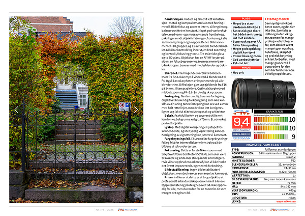 Sannsynligvis Nikons beste zoom, og det sier ikke lite. Samtidig er dette også den viktigste zoomen for mange profesjonelle fotografer, som dekker svært mange typer oppdrag. Autofokus, skarphet og praktisk betjening er klart forbedret, med mange grunner til å oppgradere for den som har første versjon. Virkelig toppklasses.