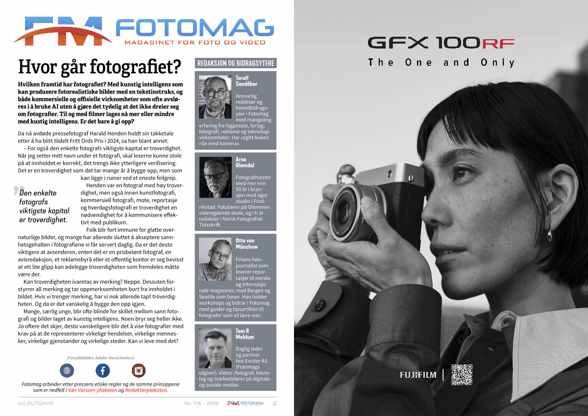 Hvilken framtid har fotografiet? Med kunstig intelligens som kan produsere fotorealistiske bilder med en tekstinstruks, og både kommersielle og offisielle virksomheter som ofte avsløres i å bruke AI uten å gjøre det tydelig at det ikke dreier seg om fotografier. Til og med filmer lages nå mer eller mindre med kustig intelligens. Er det bare å gi opp?