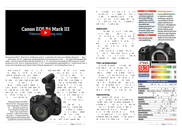 Strengt tatt er EOS R6 Mark III et hybridkamera, vel så mye optimalisert for video som stillbilder. Med inntil 120 bps i 4K tar du saktefilm i høy oppløsning, og bildestabilisatoren som kompenserer inntil 8,5 trinn gjør frihåndsopptak såre enkelt( men du trenger kanskje støtte når det blåser mye). Nytt er at Canon har droppet to SD-kortplasser, i stedet kombinerer en CFexpress type B og ett SD-kort( UHS II). Selv profesjonelle videofotografer vil finne det meste i menyene her, mens entusiasten og amatøren enkelt vil få gode opptak uten å fikle med kompliserte menyer.