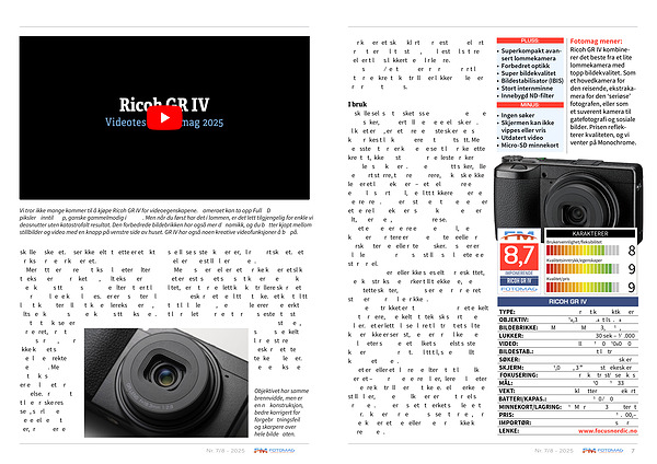 Fotomag mener: Ricoh GR IV kombinerer det beste fra et lite lommekamera med topp bildekvalitet. Som et hovedkamera for den reisende, ekstrakamera for den‘ seriøse’ fotografen, eller som et suverent kamera til gatefotografi og sosiale bilder. Prisen reflekterer kvaliteten, og vi venter på Monochrome.