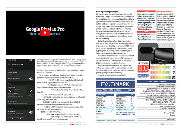 Her er en kort oversikt over de viktigste tekniske egenskapene til Google Pixel 10 Pro( og Pixel 10 Pro XL): Hovedkamera: 50 MP, f / 1.68, 25mm vidvinkel, dobbeltpiksel PDAF fase-AF, og optisk bildestabilisator. 5x telefoto: « Periskopkamera », 48 MP f / 2.8, 110mm, multiretning PDAF fase-AF og optisk bildestabilisator. Ultravidvinkel: 48 MP f / 1.7, 123 °( 12mm), dobbeltpiksel PDAF fase-AF. Selfie: 42 MP 17mm ultravidvinkel, f / 2.2, fase-AF. Skjerm: 6,3 " OLED 120Hz, HDR10 +, 1280 x 2856 px, 20:9 forhold(~ 495 ppt). Maks 3300 nits. Video: 4K 24 / 30 / 60p, OIS, gyro-elektronisk IS, 10 bit HDR. 8K / 30p, men det krever oppskalering via skyen. Batteri: Fast Li-Ion 4870 mAh, rask lading m / kabel, også trådløs lading. Lader medfølger ikke. Mål: 152,8 x 72 x 8,5 mm. 207 g. Værtetting: IP68 støv- og vanntett( inntil 1,5m i 30 min). Android-versjon: 16.0. Google Tensor G5( 3 nm) prosessor. Google lover inntil 7 store oppdateringer.