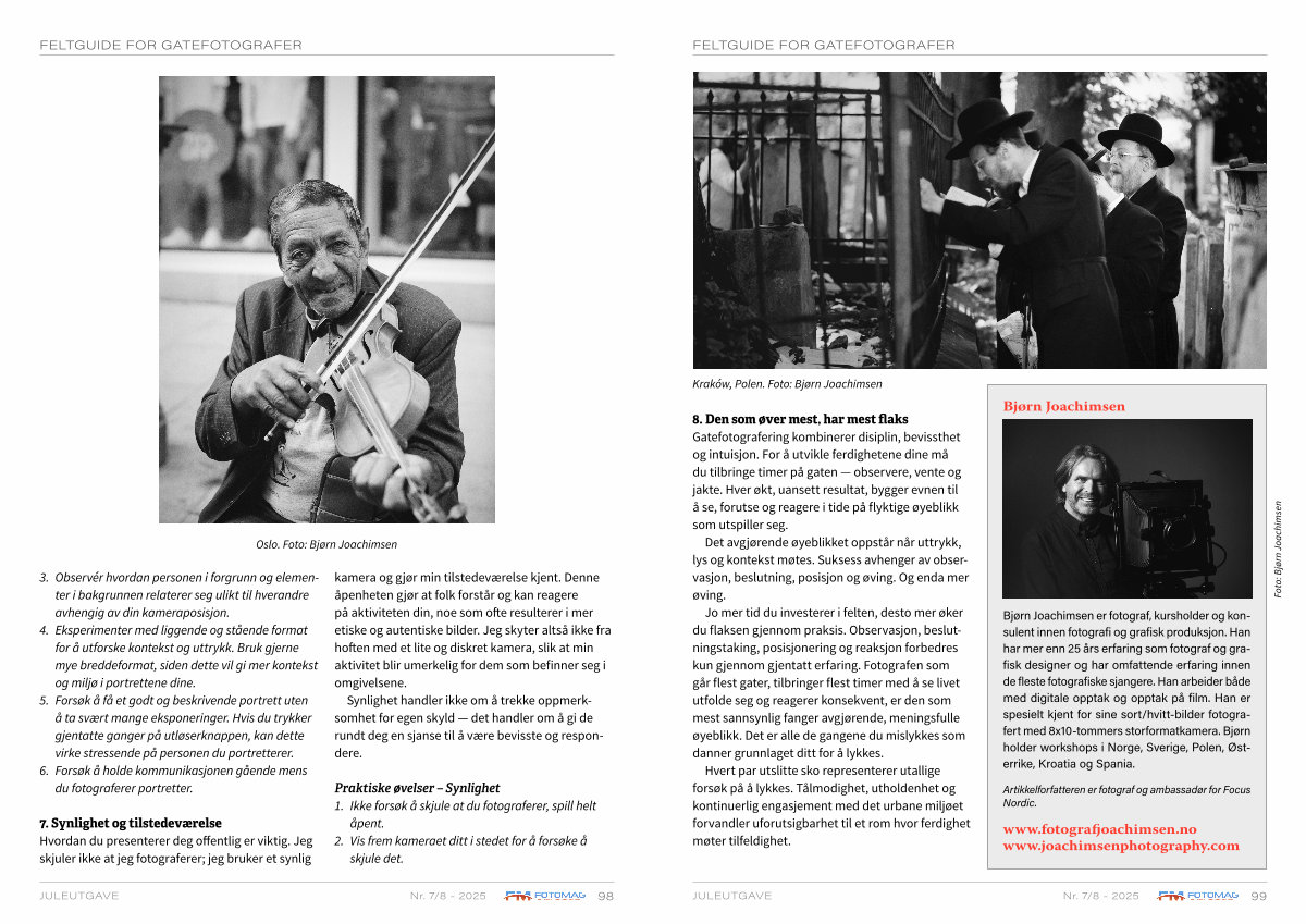8. Den som øver mest, har mest flaks Gatefotografering kombinerer disiplin, bevissthet og intuisjon. For å utvikle ferdighetene dine må du tilbringe timer på gaten— observere, vente og jakte. Hver økt, uansett resultat, bygger evnen til å se, forutse og reagere i tide på flyktige øyeblikk som utspiller seg.