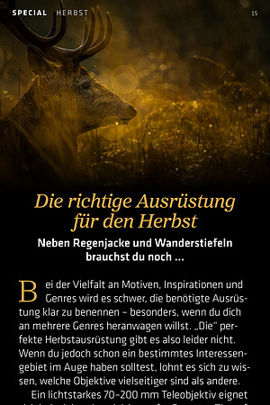 Das „ Standard“-Objektiv hat eine Brennweite von 50 mm. Das entspricht ungefähr dem menschlichen Sichtfeld. Mit einem Telezoom, also der Brennweitenbereich über 50 mm, kannst du Objekte und Szenen optisch deutlich näher heranrücken. In der Tierfotografie sind sie unverzichtbar. Wer will schon eine Herde Rehe im Nebel verscheuchen, weil er auf zehn Meter heranmuss – oder auf Safari einen Löwen? Doch du kannst damit auch Motive freistellen oder einrahmen, wie markante Bäume oder einen ansprechenderen Bildausschnitt wählen.