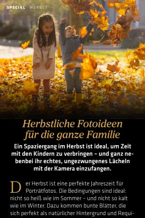 Porträtfotos. Die Bedingungen sind ideal: nicht so heiß wie im Sommer – und nicht so kalt wie im Winter. Dazu kommen bunte Blätter, die sich perfekt als natürlicher Hintergrund und Requisite eignen. Wer Kinder, Nichten, Neffen oder Enkel hat, sollte die Gelegenheit nutzen – bei einem Spaziergang entstehen ganz nebenbei schöne, natürliche Fotos. Kinder brauchen meist kaum Überredung, um Laub zu werfen oder in Pfützen zu springen. Am besten plant man das Shooting mit mindestens zwei Kindern – das nimmt ihnen die Scheu und sorgt für lebendige Momente. Für warmes Licht empfiehlt sich die goldene Stunde kurz vor Sonnenuntergang. Fotografiere am besten gegen die Sonne, um ein stimmungsvolles Gegenlicht zu erzeugen – das ermöglicht gleichzeitig kürzere Belichtungszeiten.