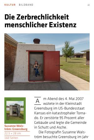 Die Fotografin Susanne Walström besuchte Greensburg im Jahr 1993 zum ersten Mal und porträtierte eine verschlafene Stadt, in der das Leben in einem langsameren Tempo verläuft. Mehr als drei Jahrzehnte und 18 Jahre nach dem verheerenden Tornado ist sie nun zurückgekehrt, um den Wandel der Stadt zu dokumentieren. Wie konnte eine Stadt, die fast völlig von der Landkarte verschwunden war, mit dem neuen Schwerpunkt Nachhaltigkeit wieder aufgebaut werden? Was ist aus den Menschen geworden, die sie einst fotografiert hat? Und wie ist es, in der „ Tornado Alley“ zu leben, einem Ort, der immer wieder von heftigen Stürmen heimgesucht wird?