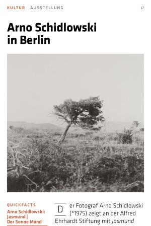 (* 1975) zeigt an der Alfred Ehrhardt Stiftung mit Jasmund und Der Sonne Mond zwei Werkserien, die unterschiedliche Zugänge zur Landschaft eröffnen. Seine ausschließlich analog und von Hand gefertigten Fotografien entstehen in langen Arbeitsprozessen und aus einer konzentrierten Auseinandersetzung mit Natur und Licht.