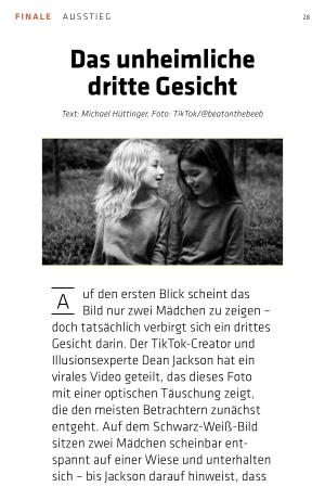 doch tatsächlich verbirgt sich ein drittes Gesicht darin. Der TikTok-Creator und Illusionsexperte Dean Jackson hat ein virales Video geteilt, das dieses Foto mit einer optischen Täuschung zeigt, die den meisten Betrachtern zunächst entgeht. Auf dem Schwarz-Weiß-Bild sitzen zwei Mädchen scheinbar entspannt auf einer Wiese und unterhalten sich – bis Jackson darauf hinweist, dass ein drittes Gesicht im Bild versteckt ist. Wie bitte? Du siehst kein drittes Gesicht? Keine Sorge, wir haben einen Tipp: Halte ein Auge zu und stelle das andere „ unscharf“ und kneife es ein wenig zu. Na? Irgendwie gruselig, oder? Aber eben auch faszinierend.