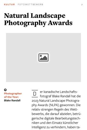 2023 Natural Landscape Photography Awards ( NLPA ) gewonnen . Die relativ strengen Regeln des Wettbewerbs , die darauf abzielen , betrügerische digitale Bearbeitungstechniken und den Einsatz künstlicher Intelligenz zu verhindern , haben talentierte Fotografen aus der ganzen Welt kaum von der Teilnahme abgehalten . Bei der diesjährigen dritten Auflage des Wettbewerbs wurden 11.176 Fotos von 1.023 Fotografen aus 54 Ländern eingereicht .