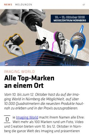 Vom 10. bis zum 12. Oktober hast du auf der Imaging World in Nürnberg die Möglichkeit, auf über 10.000 Quadratmetern die neuesten Produkte hautnah zu erleben und in der Praxis auszuprobieren.