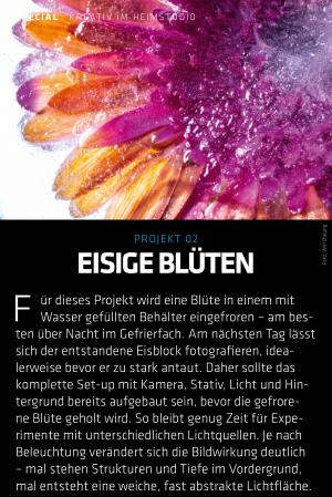 Wasser gefüllten Behälter eingefroren – am besten über Nacht im Gefrierfach. Am nächsten Tag lässt sich der entstandene Eisblock fotografieren, idealerweise bevor er zu stark antaut. Daher sollte das komplette Set-up mit Kamera, Stativ, Licht und Hintergrund bereits aufgebaut sein, bevor die gefrorene Blüte geholt wird. So bleibt genug Zeit für Experimente mit unterschiedlichen Lichtquellen. Je nach Beleuchtung verändert sich die Bildwirkung deutlich – mal stehen Strukturen und Tiefe im Vordergrund, mal entsteht eine weiche, fast abstrakte Lichtfläche. Ob seitlich, von unten oder mit mehreren Lichtquellen kombiniert: Dieses Projekt lädt zum Ausprobieren ein. Zudem kann es mit unterschiedlichen Blüten wiederholt werden.
