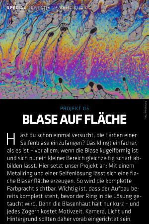 Seifenblase einzufangen? Das klingt einfacher, als es ist – vor allem, wenn die Blase kugelförmig ist und sich nur ein kleiner Bereich gleichzeitig scharf abbilden lässt. Hier setzt unser Projekt an: Mit einem Metallring und einer Seifenlösung lässt sich eine flache Blasenfläche erzeugen. So wird die komplette Farbpracht sichtbar. Wichtig ist, dass der Aufbau bereits komplett steht, bevor der Ring in die Lösung getaucht wird. Denn die Blasenhaut hält nur kurz – und jedes Zögern kostet Motivzeit. Kamera, Licht und Hintergrund sollten daher vorab eingerichtet sein.