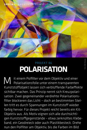 Kunststoffobjekt lassen sich verblüffende Farbeffekte sichtbar machen. Das Prinzip nennt sich Kreuzpolarisation: Zwei gegeneinander verdrehte Polarisationsfilter blockieren das Licht – doch an bestimmten Stellen tritt es durch Spannungen im Kunststoff wieder farbig hervor. Für dieses Projekt reicht bereits ein Kit- Objektiv aus. Als Motiv eignen sich alle durchsichtigen Kunststoffgegenstände – etwa zerknülltes Klebeband, ein Geodreieck oder auch Plastikbesteck. Drehe nun den Polfilter am Objektiv, bis die Farben im Bild aufleuchten – der Effekt ist sofort sichtbar und lädt zum Experimentieren ein.