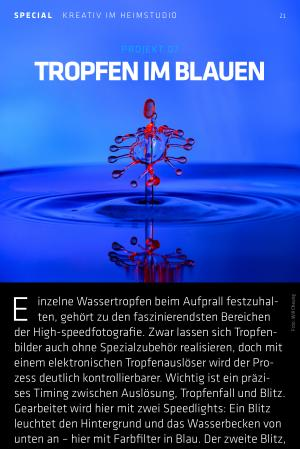 der High-speedfotografie. Zwar lassen sich Tropfenbilder auch ohne Spezialzubehör realisieren, doch mit einem elektronischen Tropfenauslöser wird der Prozess deutlich kontrollierbarer. Wichtig ist ein präzises Timing zwischen Auslösung, Tropfenfall und Blitz. Gearbeitet wird hier mit zwei Speedlights: Ein Blitz leuchtet den Hintergrund und das Wasserbecken von unten an – hier mit Farbfilter in Blau. Der zweite Blitz, mit rotem Filter und Wabenvorsatz, richtet sich gezielt auf die Stelle, an der der Tropfen auftrifft. Beide Blitze laufen mit minimaler Leistung( 1 / 128 oder 1 / 256), um extrem kurze Leuchtzeiten zu erzielen. Als Belichtungszeit dient die Blitzsynchronzeit – meist 1 / 200 oder 1 / 250 s –, da die eigentliche Belichtung durch den Blitz erfolgt. Mit etwas Übung lassen sich so gestochen scharfe Tropfenformationen einfangen.