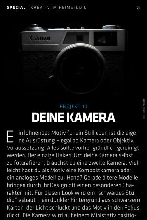 Voraussetzung: Alles sollte vorher gründlich gereinigt werden. Der einzige Haken: Um deine Kamera selbst zu fotorafieren, brauchst du eine zweite Kamera. Vielleicht hast du als Motiv eine Kompaktkamera oder ein analoges Modell zur Hand? Gerade ältere Modelle bringen durch ihr Design oft einen besonderen Charakter mit. Für diesen Look wird ein „ schwarzes Studio“ gebaut – ein dunkler Hintergrund aus schwarzem Karton, der Licht schluckt und das Motiv in den Fokus rückt. Die Kamera wird auf einem Ministativ positioniert und mit Langzeitbelichtung und Lichtmalerei in Szene gesetzt. Eine Taschenlampe mit Diffusor( z. B. ein Stück Papier) sorgt für gezielte Akzente – so wird aus funktionalem Werkzeug ein echtes Porträt.