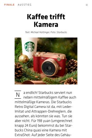 N a endlich! Starbucks serviert nun neben mittelmäßigem Kaffee auch mittelmäßige Kameras. Die Starbucks Retro Digital Camera ist da, mit Leder- Imitat und Attrappen-Drehreglern, die aussehen, als könnten sie was. Tun sie aber nicht. Für 198 yuan( umgerechnet knapp 24 Euro) bekommst du bei Starbucks China quasi eine Kamera mit ExtraShot: Auf jeder Seite des Gehäuses befindet sich eine Linse. Eine an der traditionellen Stelle, die andere auf der Rückseite, wo sich normalerweise der Sucher befindet. Na klar, für das Insta- Selfie mit dem Trendgetränk der Saison in der Hand.