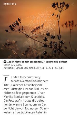 Titel „ Goldener Altweibersommer“ kürte die Jury das Bild „ es ist nichts so fein gesponnen …“ von Monika Bönisch zum Siegerbild. Die Fotografin nutzte die aufgehende, warme Sonne, um im Gegenlicht die von Tau nassen Spinnweben an vertrockneten Ästen in Szene zu setzen. Herzlichen Glückwunsch. Zeige Deine Fotos. Finde neue Freunde. Tausche Dich aus. Lerne Neues. Jetzt kostenfrei Mitglied auf fotocommunity. de werden.