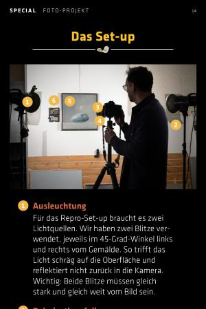 Für das Repro-Set-up braucht es zwei Lichtquellen. Wir haben zwei Blitze verwendet, jeweils im 45-Grad-Winkel links und rechts vom Gemälde. So trifft das Licht schräg auf die Oberfläche und reflektiert nicht zurück in die Kamera. Wichtig: Beide Blitze müssen gleich stark und gleich weit vom Bild sein.