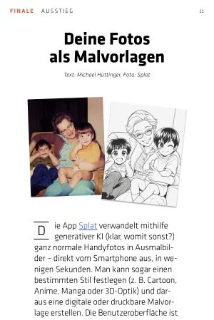 ganz normale Handyfotos in Ausmalbilder – direkt vom Smartphone aus, in wenigen Sekunden. Man kann sogar einen bestimmten Stil festlegen( z. B. Cartoon, Anime, Manga oder 3D-Optik) und daraus eine digitale oder druckbare Malvorlage erstellen. Die Benutzeroberfläche ist bewusst minimalistisch gehalten, ohne Pop-ups oder Ablenkung – so können auch Kinder sie weitgehend selbstständig nutzen. Um versehentliche Käufe zu vermeiden, sind Abo-Funktionen und Einstellungen durch eine Altersabfrage geschützt.