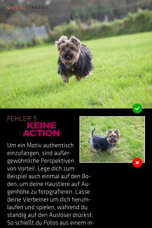 Um ein Motiv authentisch einzufangen, sind außergewöhnliche Perspektiven von Vorteil. Lege dich zum Beispiel auch einmal auf den Boden, um deine Haustiere auf Augenhöhe zu fotografieren. Lasse deine Vierbeiner um dich herumlaufen und spielen, während du ständig auf den Auslöser drückst. So schießt du Fotos aus einem interessanteren Blickwinkel, den wir in unserem Alltag gewöhnlich nicht kennen.