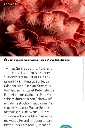 zunächst rätseln: Ist das ein Korallenriff? Ein florales Stillleben? Oder ein High-Fashion-Stoffmuster? Tatsächlich zeigt Kate Irelands Foto einen rosafarbenen Pilz. Mit seinem dramatischen Faltenwurf