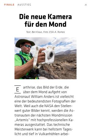 Astronaut William Anders ist vielleicht eine der bedeutendsten Fotografien der Welt . Weil auch die NASA den Stellenwert guter Bilder kennt , werden die Astronauten der nächsten Mondmission „ Artemis “ mit hochprofessionellen Kameras ausgestattet . Das technische Meisterwerk kann bei hellstem Tageslicht und tief in Vulkanhöhlen arbeiten . Sie funktioniert in einem Temperaturbereich von minus 200 bis plus 120 Grad Celsius , hat einen Staubschutz und muss natürlich mit den extrem dicken Handschuhen bedienbar sein . Getestet wird die Kamera zusammen mit der ESA im Rahmen des PANGEA-Trainings auf der mondähnlichen Landschaft von Lanzarote .