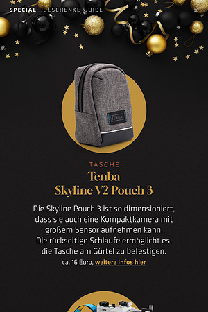 Die Skyline Pouch 3 ist so dimensioniert, dass sie auch eine Kompaktkamera mit großem Sensor aufnehmen kann. Die rückseitige Schlaufe ermöglicht es, die Tasche am Gürtel zu befestigen. ca. 16 Euro, weitere Infos hier