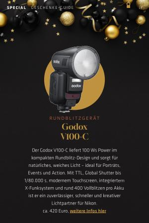 Der Godox V100-C liefert 100 Ws Power im kompakten Rundblitz-Design und sorgt für natürliches, weiches Licht – ideal für Porträts, Events und Action. Mit TTL, Global Shutter bis 1 / 80.000 s, modernem Touchscreen, integriertem X-Funksystem und rund 400 Vollblitzen pro Akku ist er ein zuverlässiger, schneller und kreativer Lichtpartner für Nikon. ca. 420 Euro, weitere Infos hier